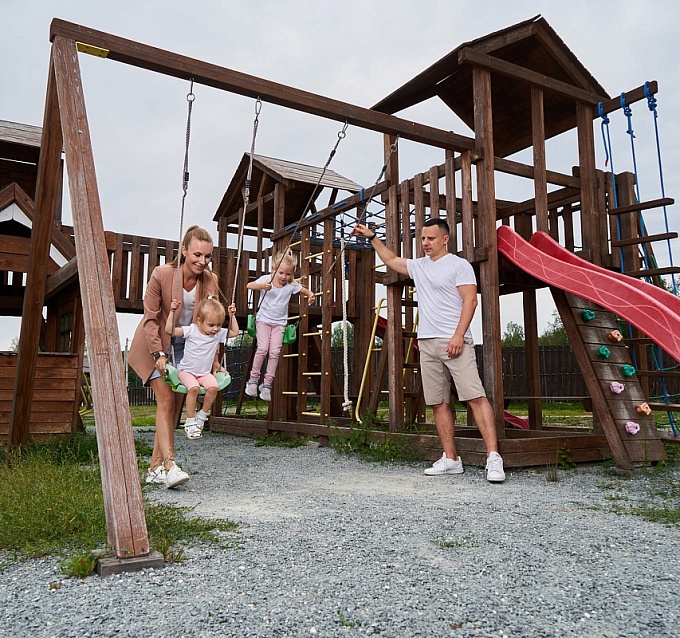 Для малышей построен современный городок из экоматериалов, для спокойного отдыха и прогулок – лаунж-зоны и прогулочные аллеи. Скоро появится зона воркаута, футбольное и волейбольное поля.