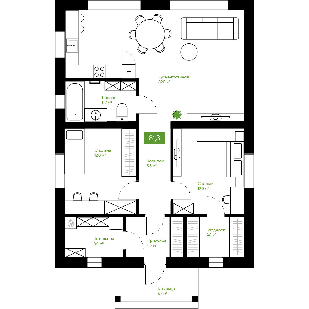 Застройщик уже завел в дом и развел: воду по мокрым точкам, электричество под розетки, установил электрокотел в техническом помещении. Устроил внешнюю водосточную систему и канализацию — септик 7 м² с 2 переливными кольцами 1,5 м. Стены выровнены, на полу полусухая стяжка и система теплый водяной пол. На крыше установлены снегозадержатели.